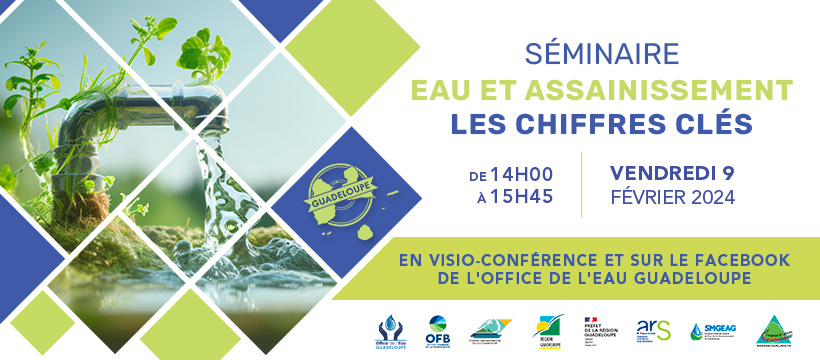 L’Office de l’Eau, l’Office Français de la Biodiversité, le Conseil Départemental, le Conseil Régional, l’État, l’Agence Régionale de Santé, le Syndicat Mixte de Gestion de l’Eau et de l’Assainissement de Guadeloupe ainsi que la Communauté de Communes de Marie-Galante ont le plaisir de vous convier au séminaire de restitution de la 6ème édition des chiffres clés de l’eau et de l’assainissement de Guadeloupe, qui sera retransmis en live sur le Facebook de l’Office de l’Eau le vendredi 9 février de 14h à 15h45 !