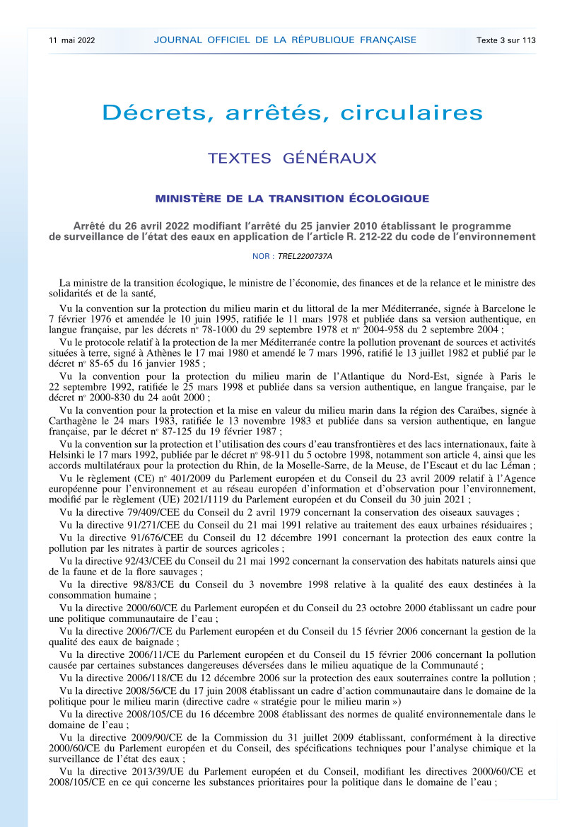 Arrêté du 26 avril 2022 modifiant l’arrêté du 25 janvier 2010 établissant le programme de surveillance de l’état des eaux