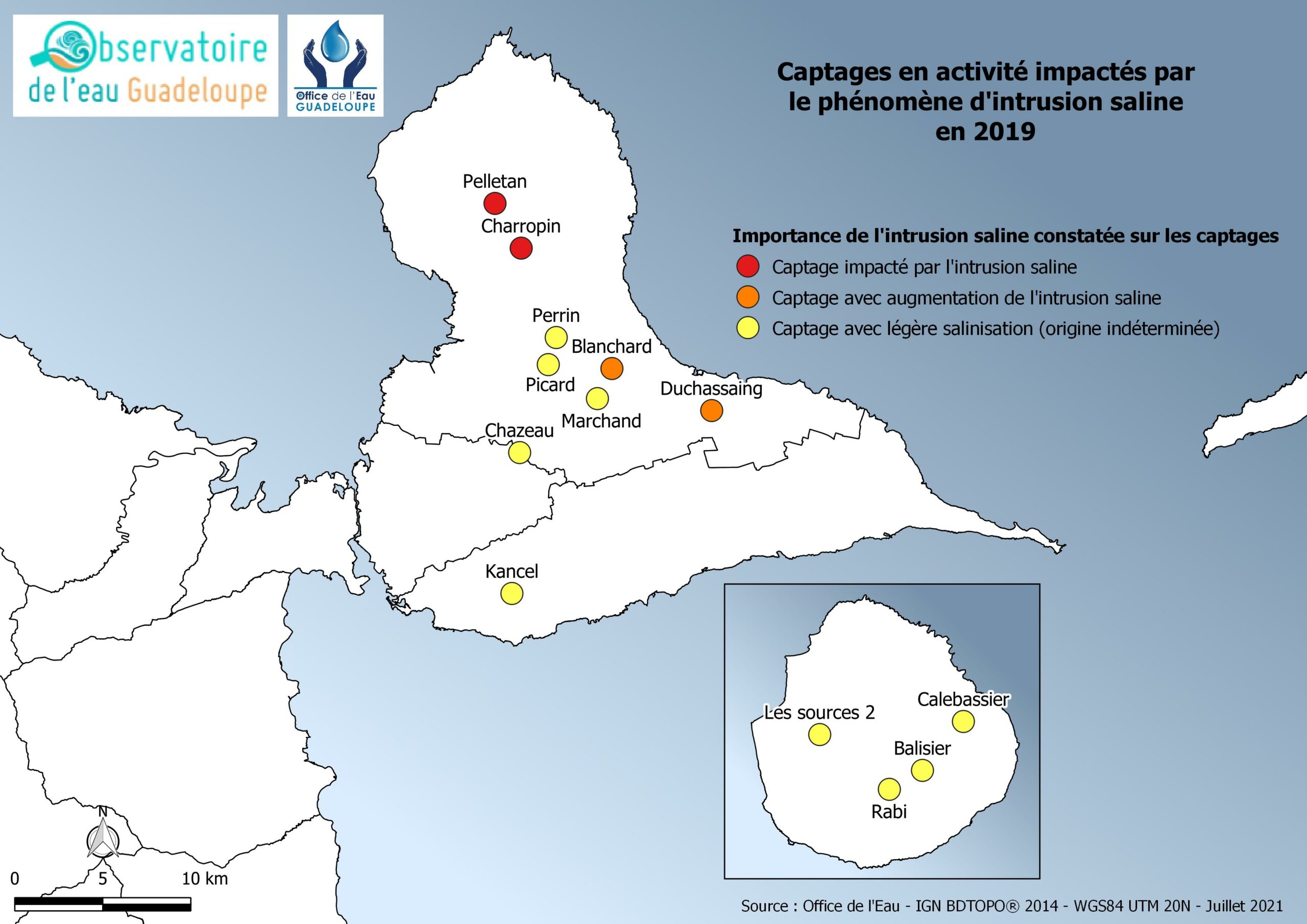 Captages en activité impactés par le phénomène d’intrusion saline en Guadeloupe en 2019