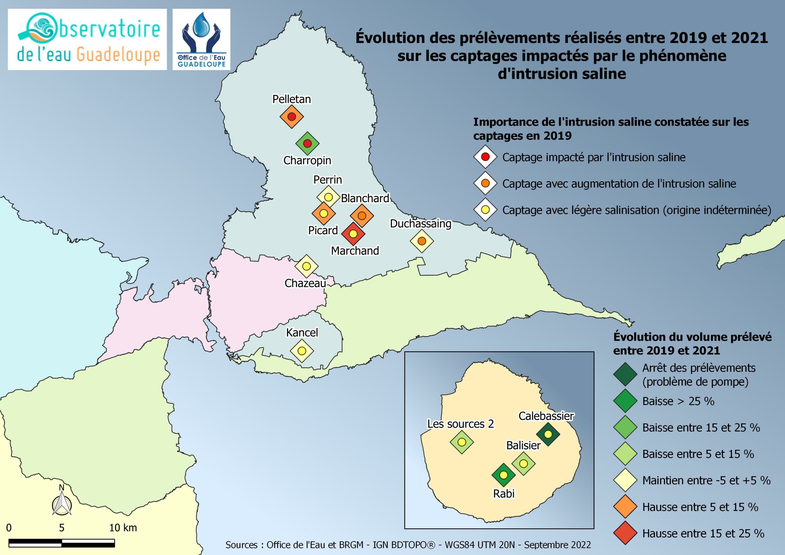 Évolution des prélèvements réalisés entre 2019 et 2021 sur les captages impactés par le phénomène d’intrusion saline