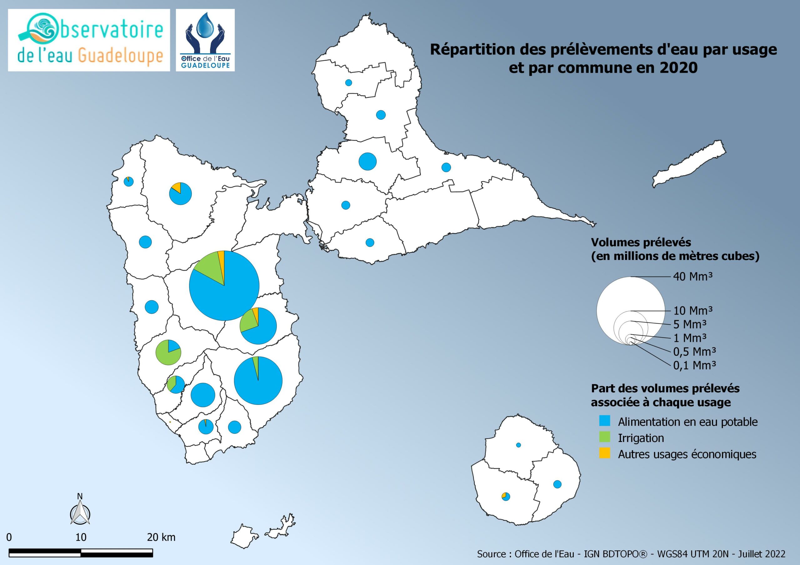 Évolution des volumes prélevés pour l’AEP à l’échelle communale en Guadeloupe entre 2021 et 2022