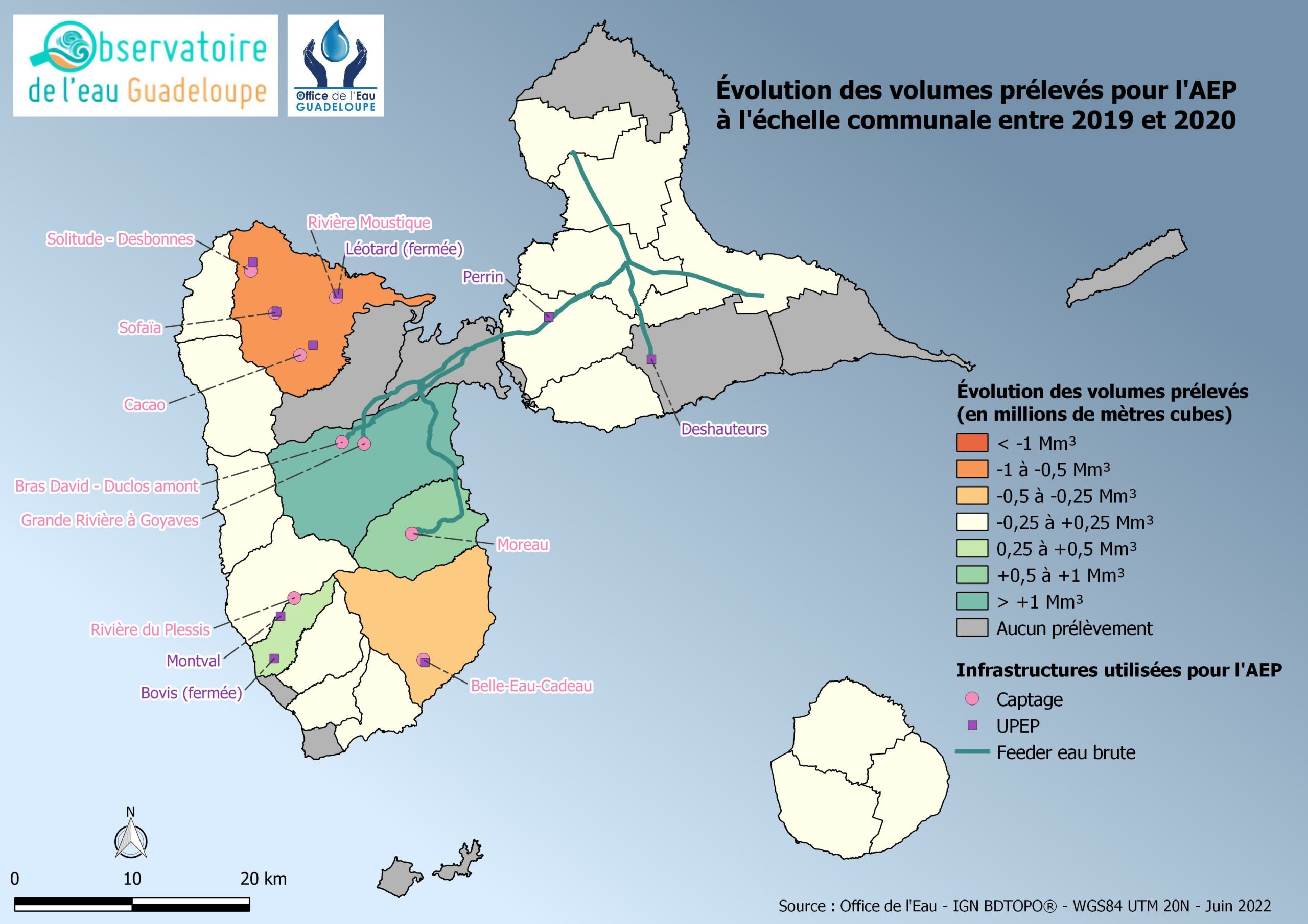 Évolution des volumes prélevés pour l’AEP à l’échelle communale en Guadeloupe entre 2019 et 2020