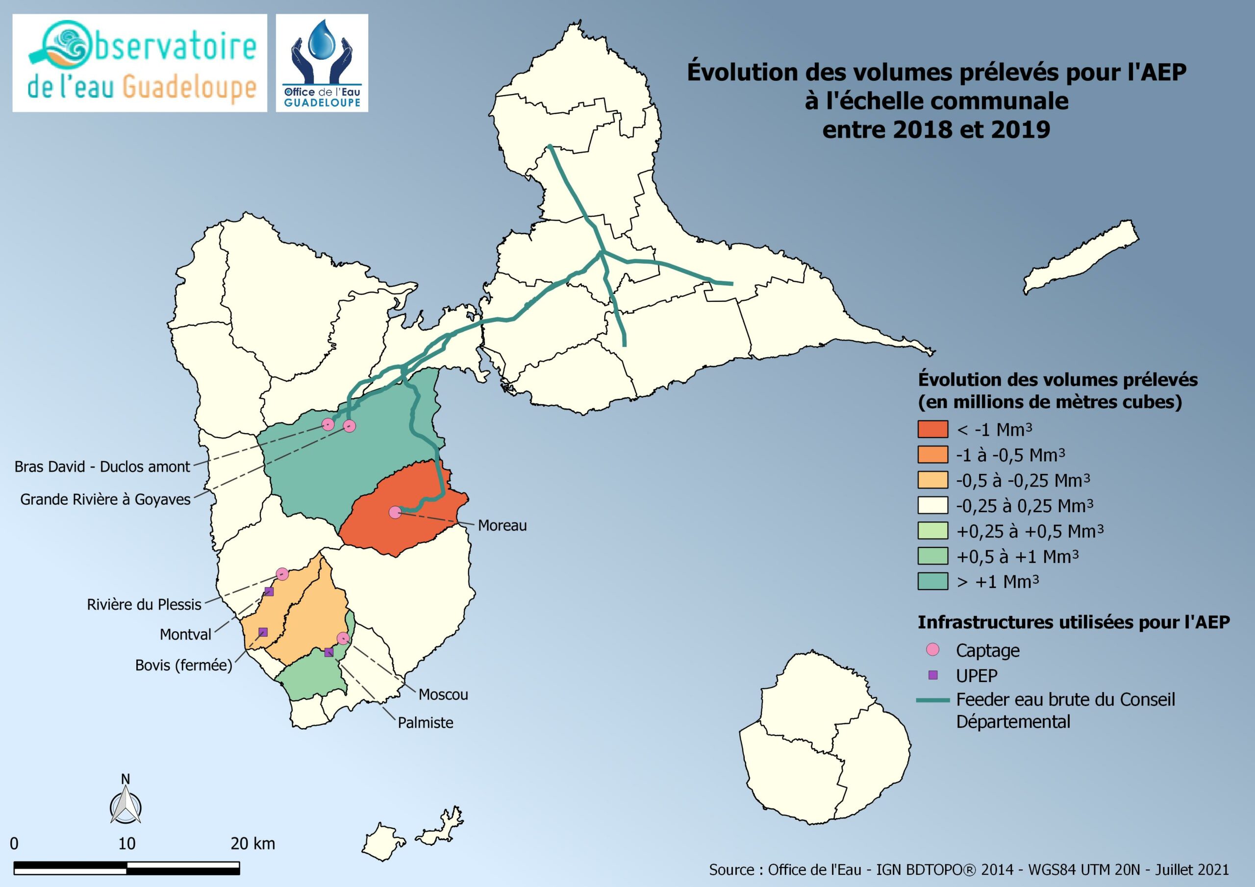 Évolution des volumes prélevés pour l’AEP à l’échelle communale en Guadeloupe entre 2018 et 2019