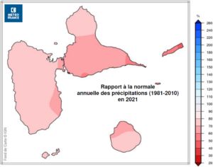 Rapport à la normale annuelle de précipitation 1981-2010 en Guadeloupe en 2021 (Météo-France)