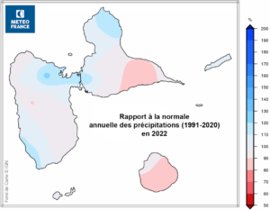 Rapport à la normale annuelle de précipitation 1991-2020 en Guadeloupe en 2022 (Météo-France)