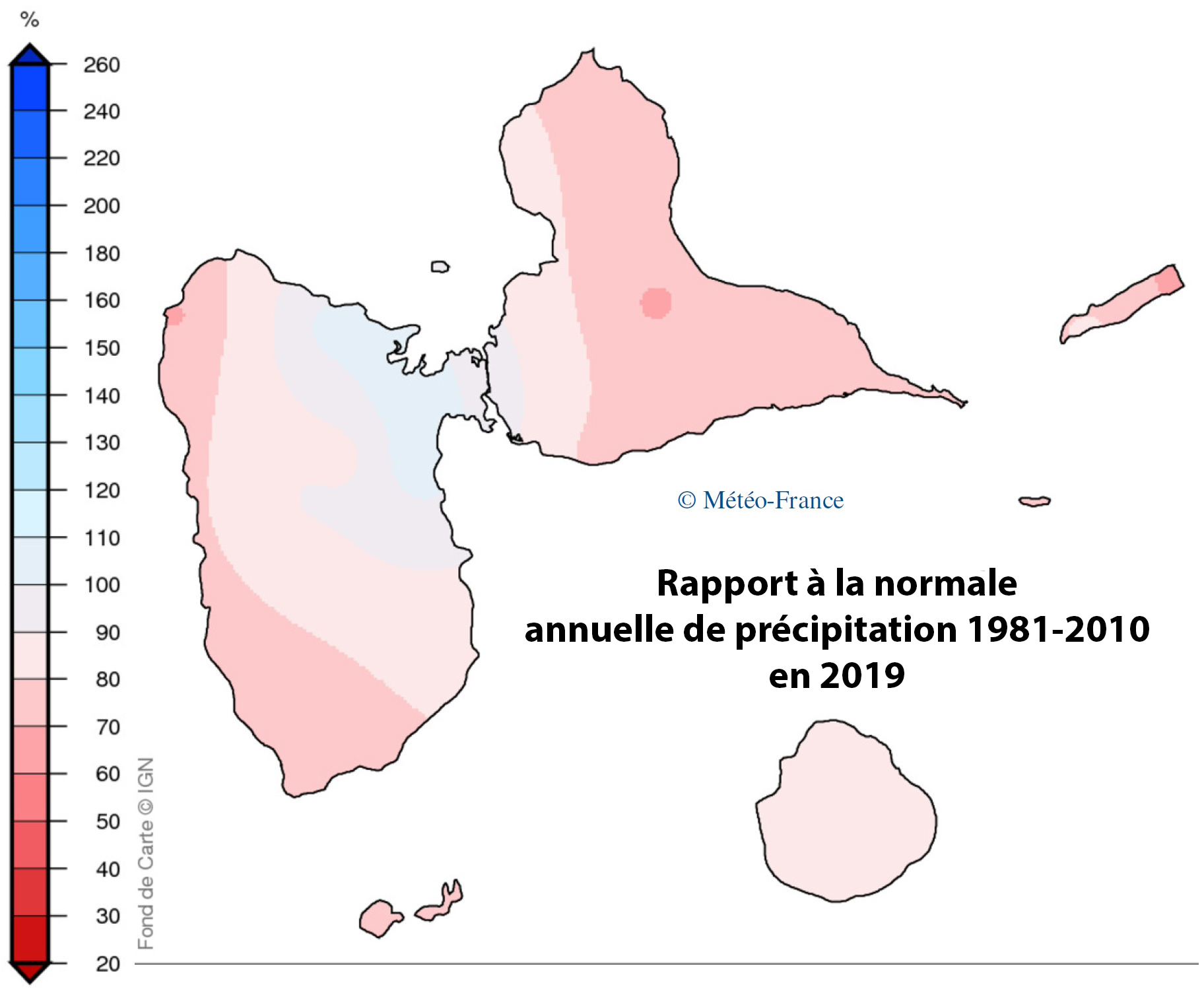 Rapport à la normale annuelle de précipitation 1981-2010 en Guadeloupe en 2019 (Météo-France)