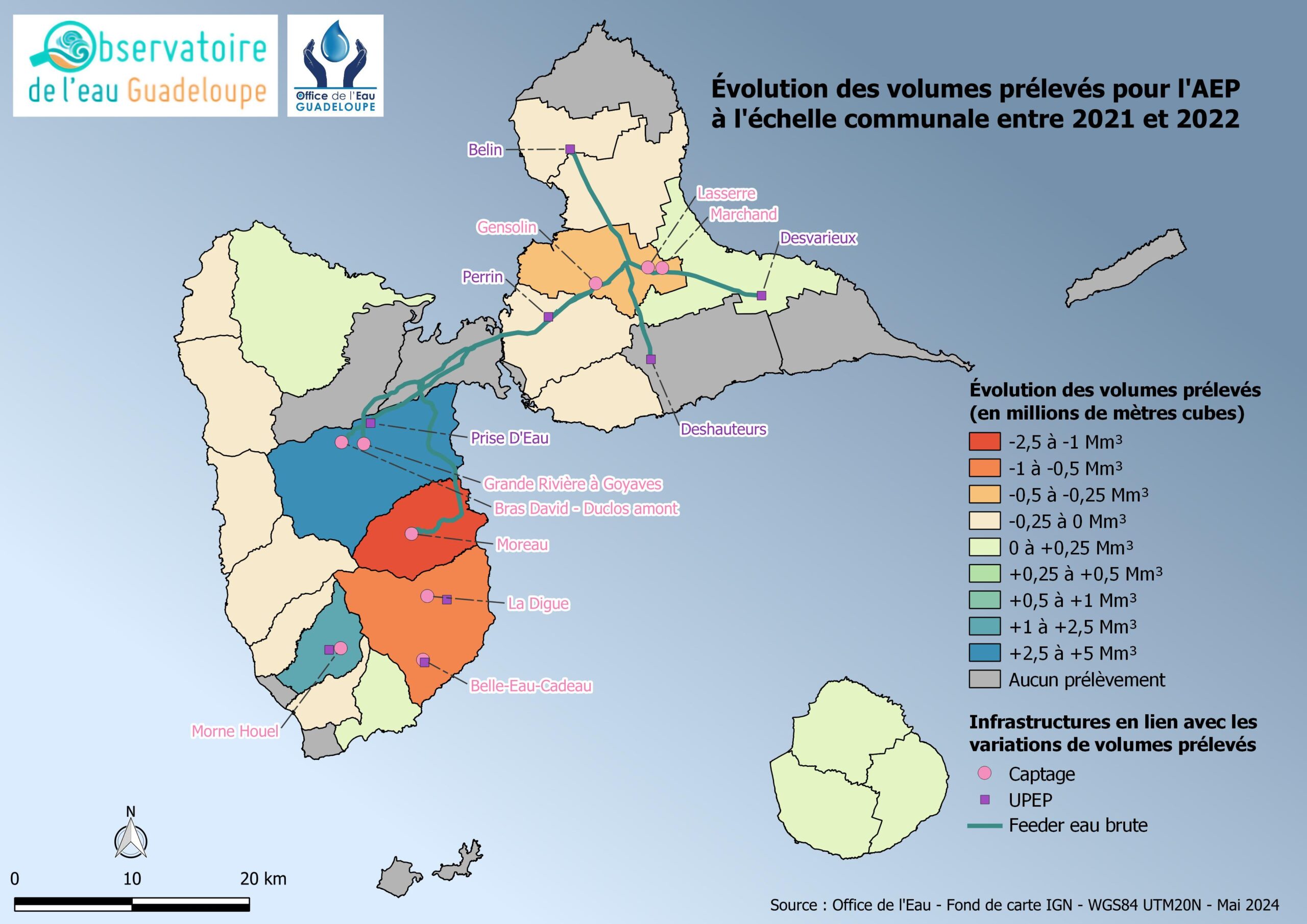 Évolution des volumes prélevés pour l’AEP à l’échelle communale en Guadeloupe entre 2021 et 2022