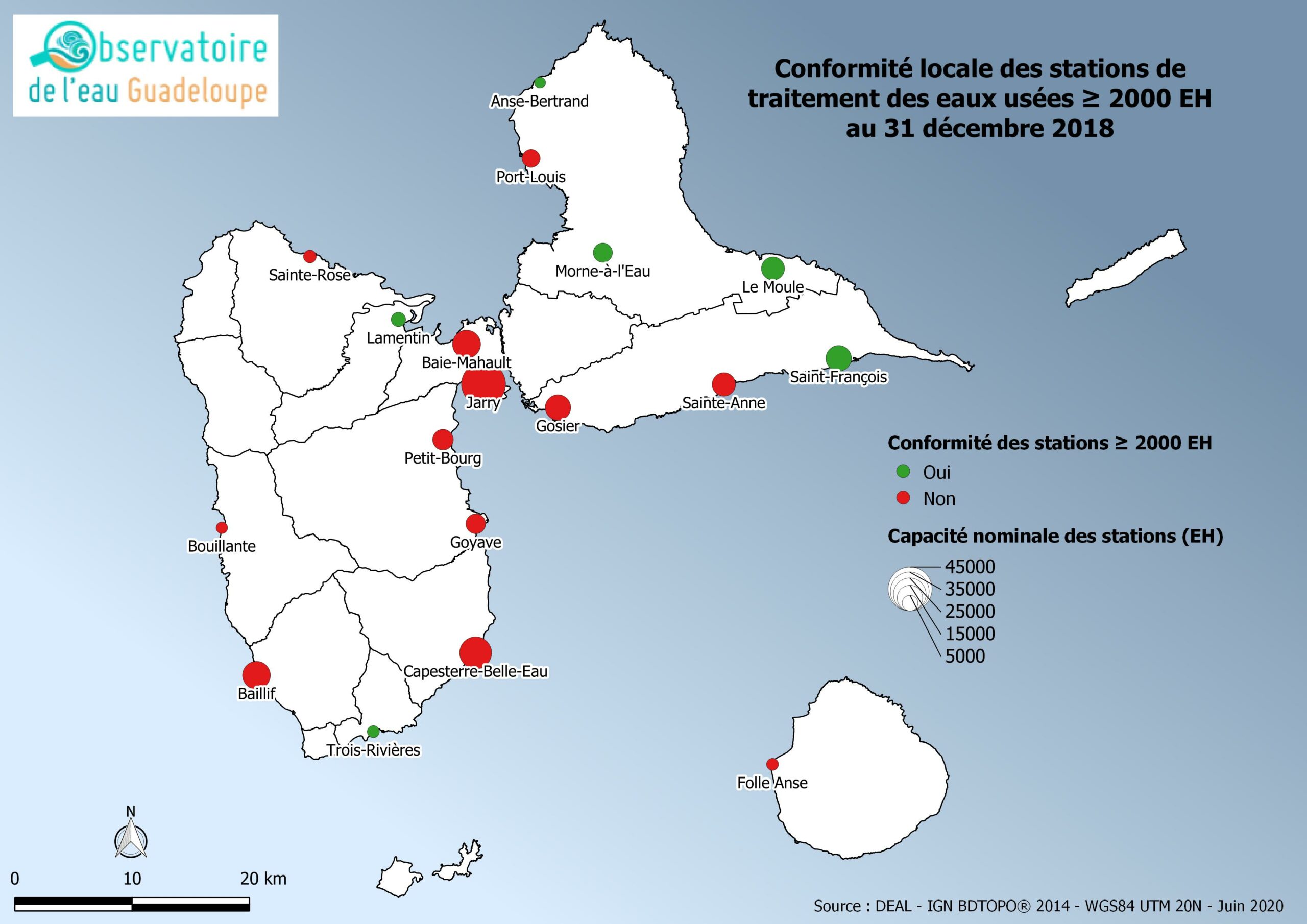 Conformité locale des stations de traitement des eaux usées ≥ 2000 EH de Guadeloupe au 31 décembre 2018