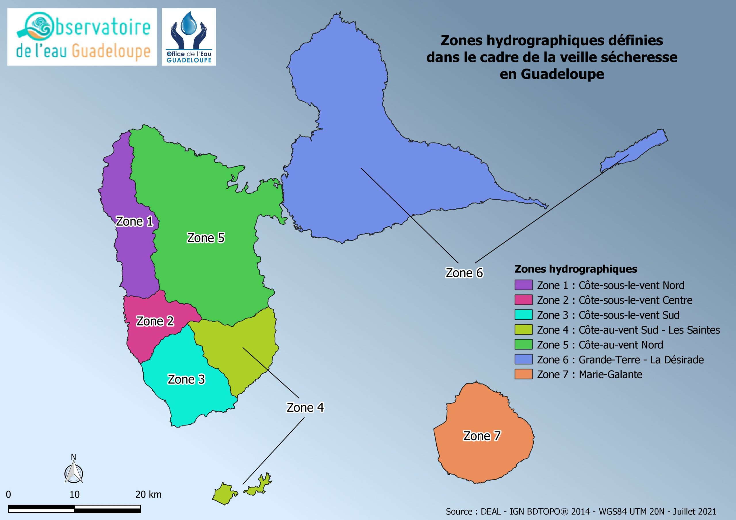 Zones hydrographiques définies dans le cadre de la veille sécheresse de Guadeloupe