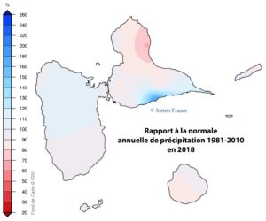 Rapport à la normale annuelle de précipitation 1981-2010 en Guadeloupe en 2018 (Météo-France)