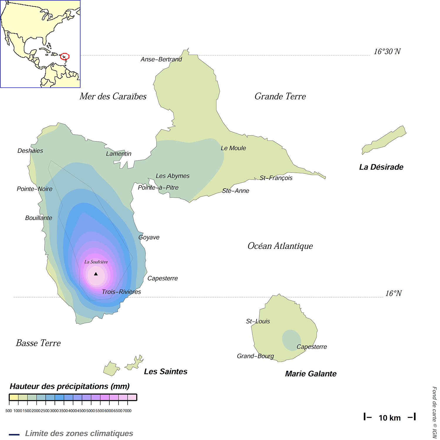 Normale annuelle spatialisée des cumuls de précipitation en Guadeloupe sur la période 1981-2010 (Météo-France)