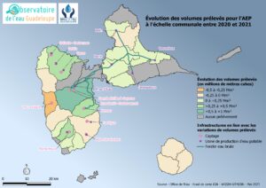 Évolution des volumes prélevés pour l’AEP à l’échelle communale en Guadeloupe entre 2020 et 2021