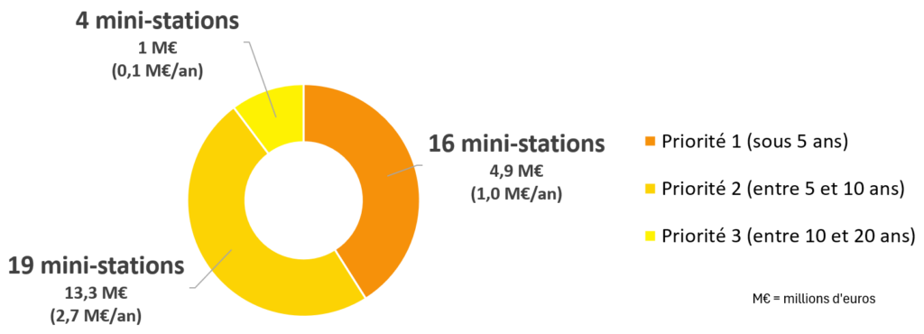 Des travaux sont nécessaires sur 39 mini-stations publiques. Pour les secteurs sur lesquels des problèmes/besoins avaient été identifiés, différents scenarii ont été étudiés pour repenser les systèmes de traitement (réhabilitation ou construction de nouvelles stations avec reconfiguration du réseau). Au final, les besoins en travaux sur les PR sont les suivants :