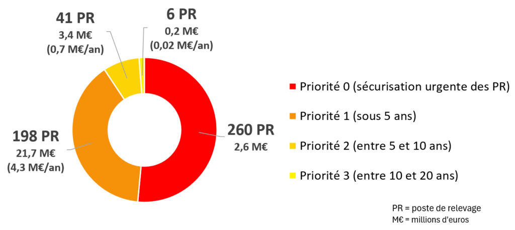 Préconisation 1 : mettre en état de fonctionnement tous les postes de relevage (PR) : renouvellement complet, réhabilitation / renouvellement des chambres de vannes, réhabilitation des bâches, remplacement des pompes, remplacement des armoires électriques, télégestion et alarme, sécurisation, traitement des sulfures).