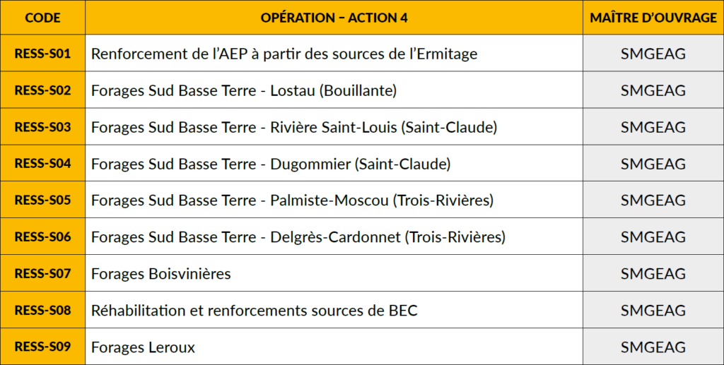 Les opérations de l’action 4 du plan d’accélération du PPI concernent la diversification de la ressource par la mobilisation d’eaux souterraines, pour un montant de 6 millions d’euros.