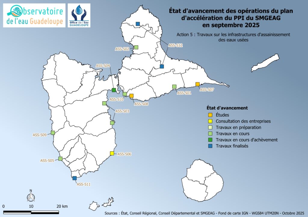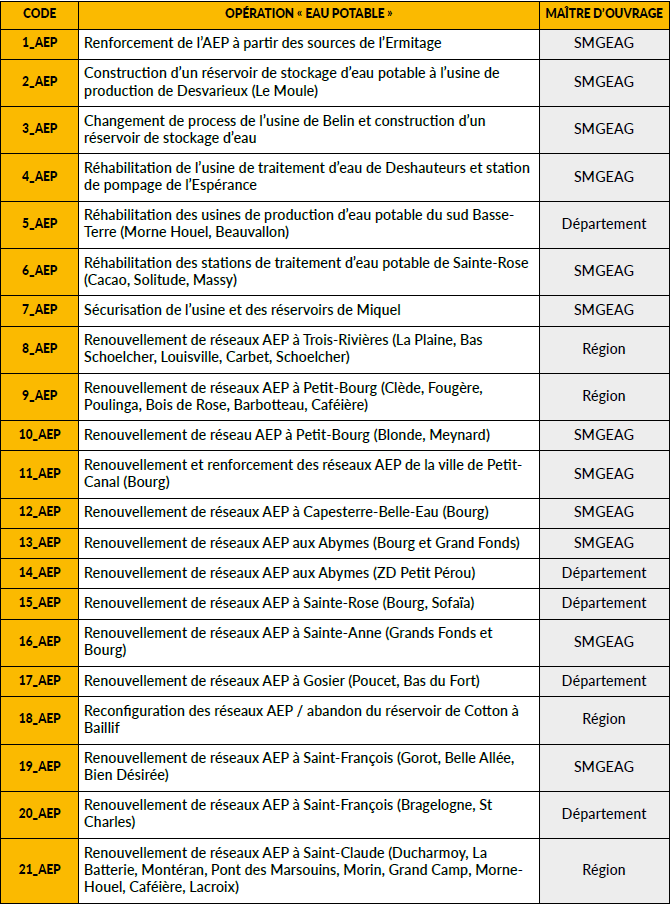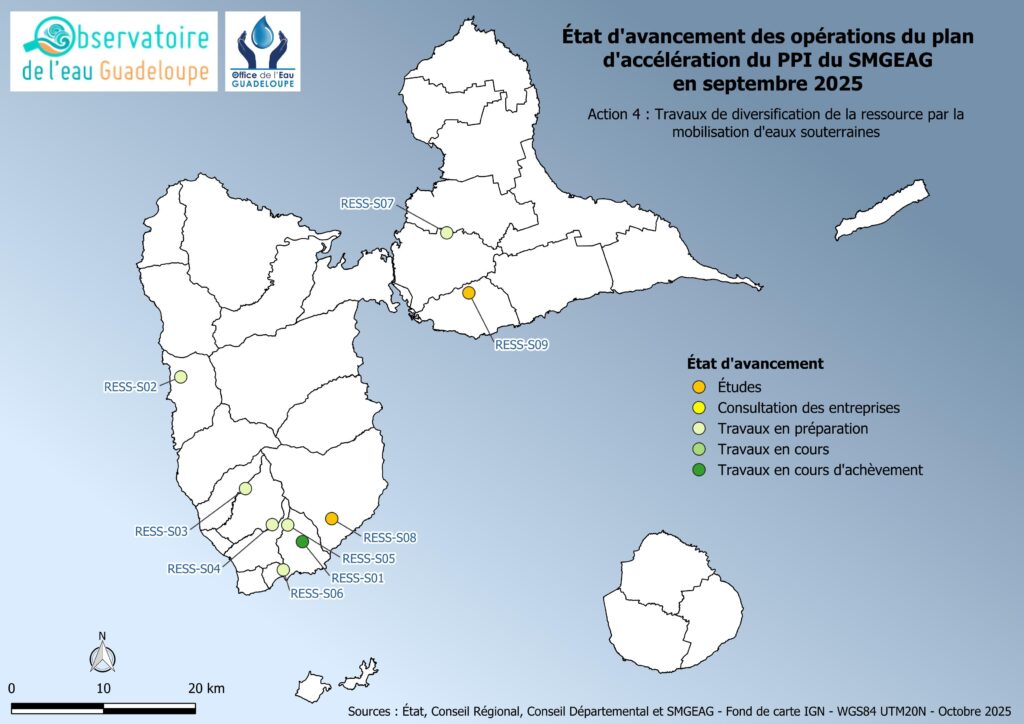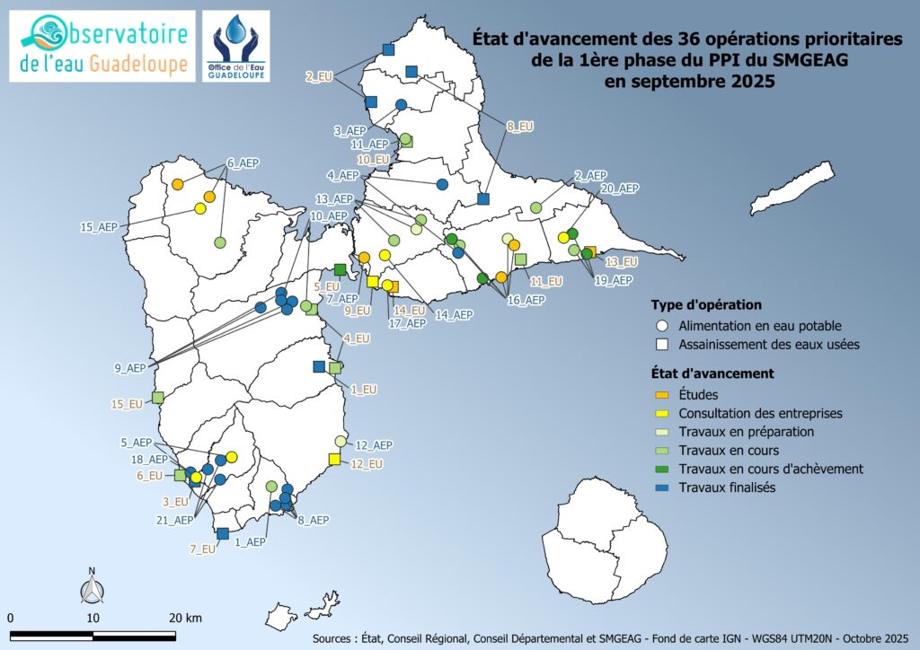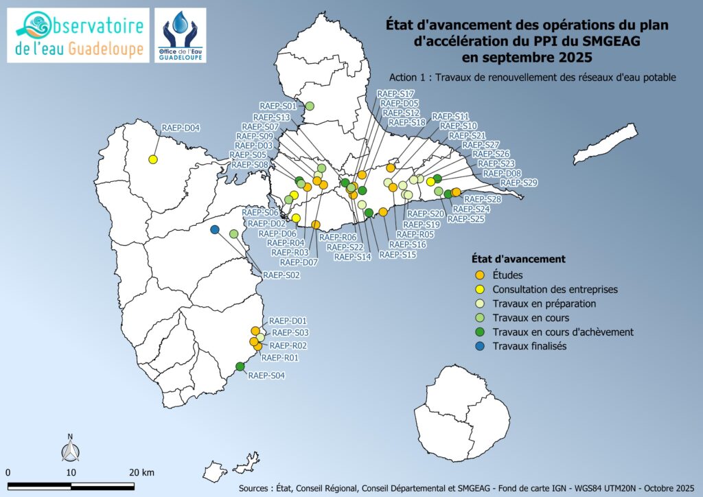 - la sortie des tours d’eau à 100 % sur les communes de Sainte-Anne, Saint-François, La Désirade, Le Gosier, Capesterre-Belle-Eau, Terre-de-Haut, Terre-de-Bas et Trois-Rivières ;