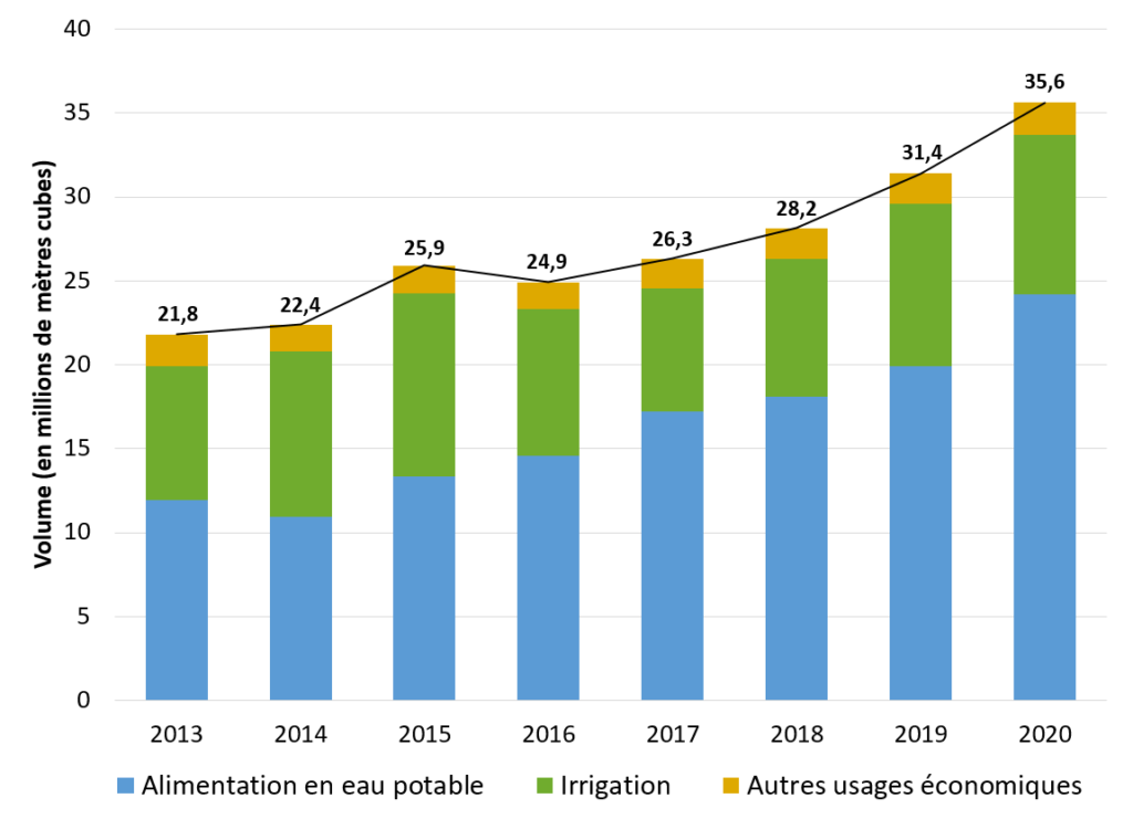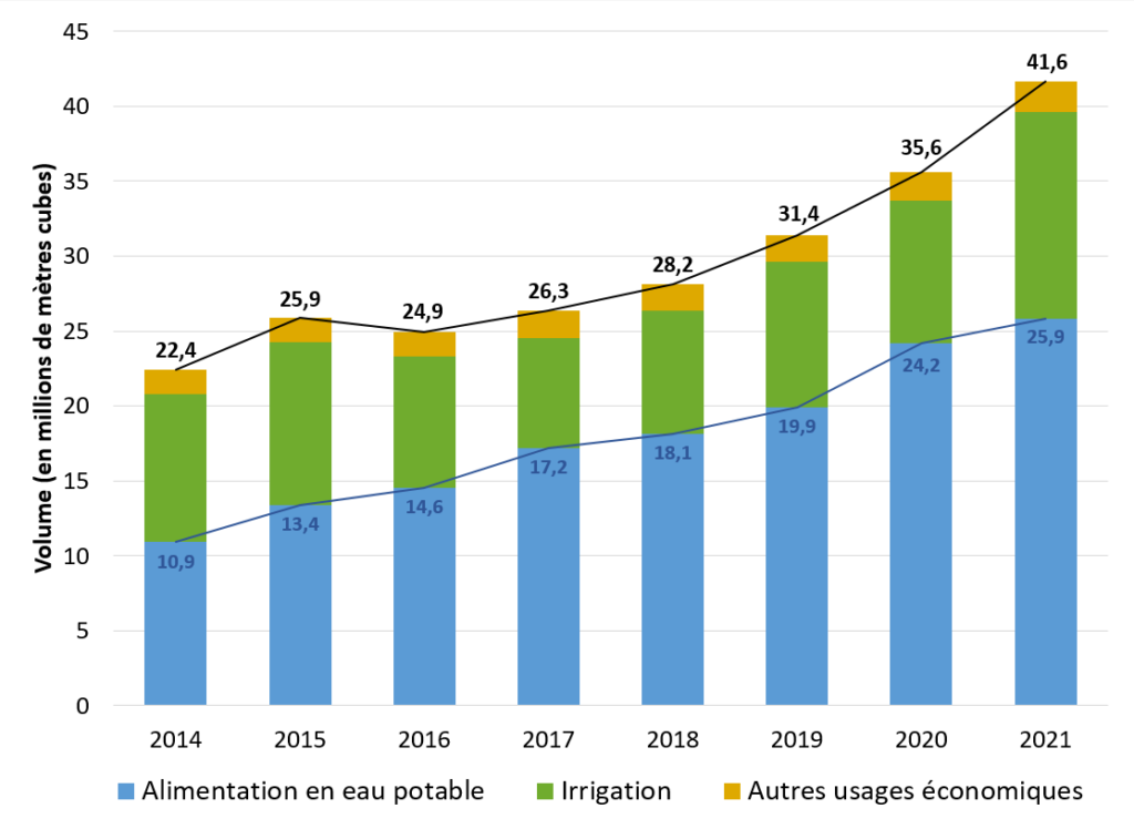 En effet, la part des prélèvements réalisés par le Conseil Départemental pour cet usage a atteint en 2021 28,8 % du volume total (de 88,4 Mm3) prélevé pour l’eau potable en Guadeloupe, alors qu’elle ne représentait que 15,4 % en 2014.