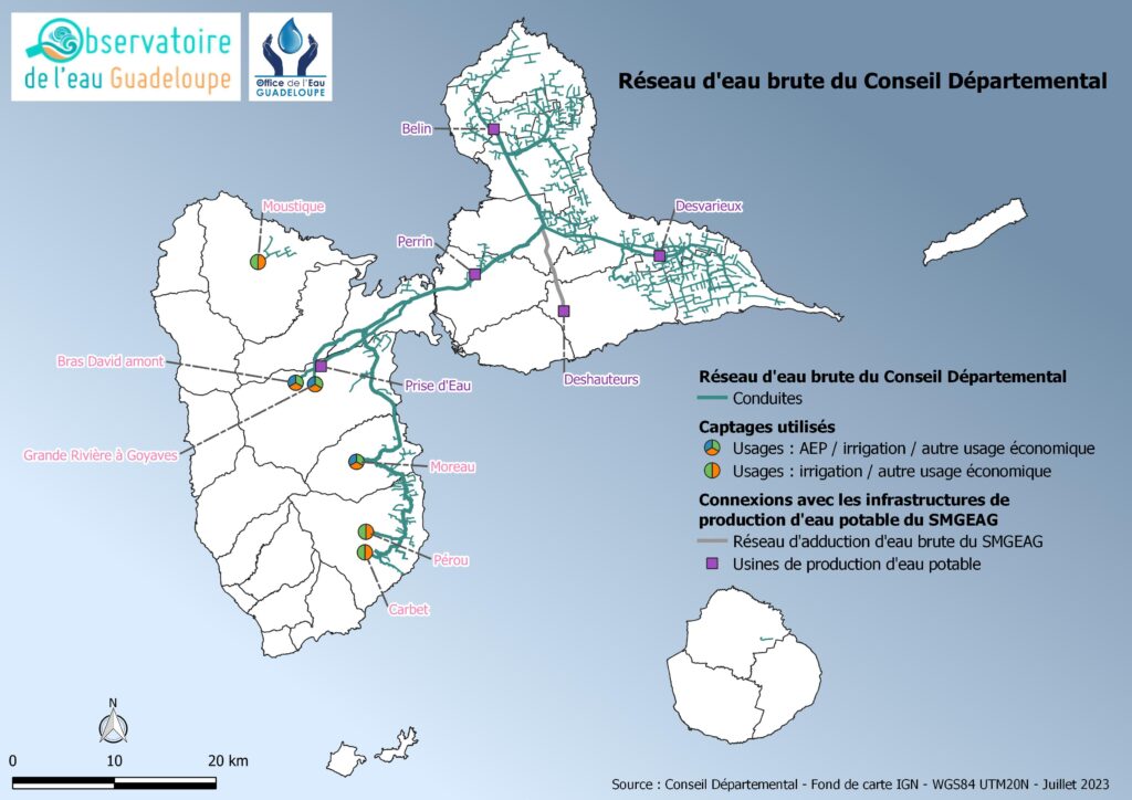 Le Conseil Départemental de la Guadeloupe est un acteur majeur de l’exploitation de la ressource en eau. Il fournit chaque année entre 65 et 75 % de l’eau agricole utilisée en Guadeloupe grâce à son important réseau de transfert d’eau brute (exploité par son délégataire Karuker’ô). Il met également de l’eau à disposition pour les autres usages, en fournissant notamment un soutien de plus en plus important à l’alimentation en eau potable.