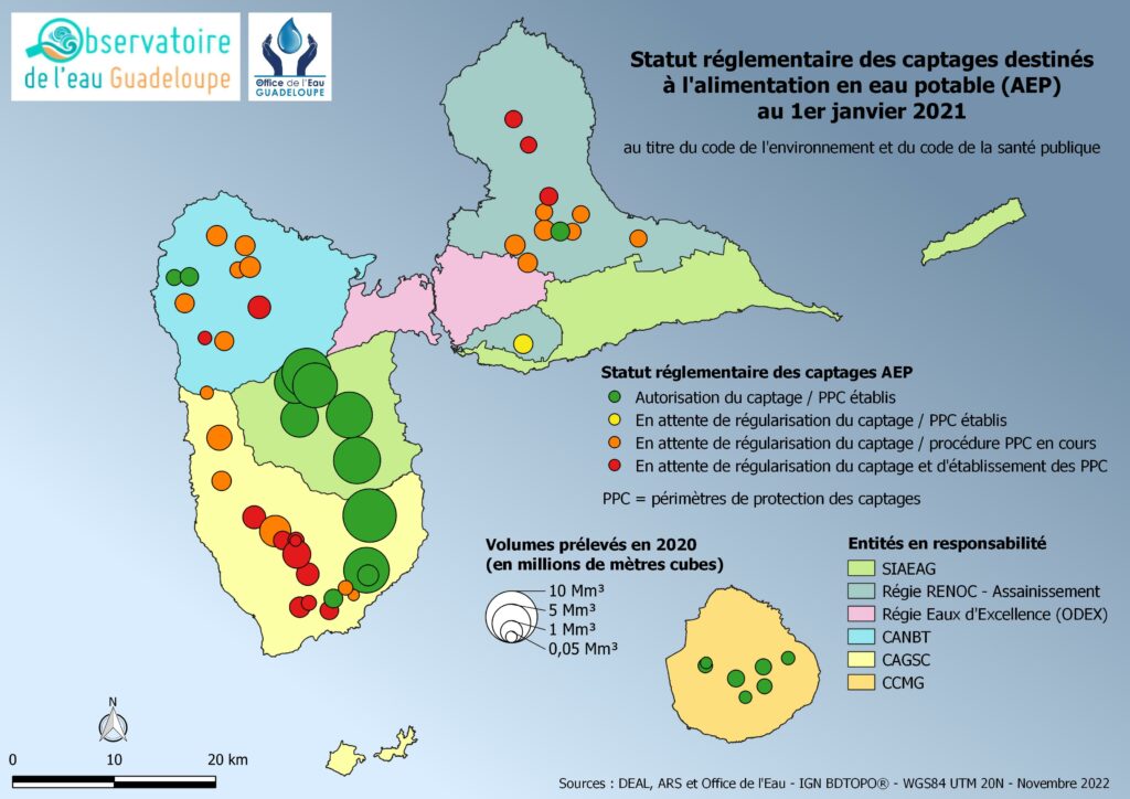 Au 31 décembre 2022, seuls 39 % des captages d’eau potable de Guadeloupe disposaient d’une autorisation d’exploitation et d’une délimitation des PPC (la mise en œuvre et le suivi des mesures de protection restent cependant à conforter, voire à mettre en place). Ces captages prélèvent néanmoins 76 % du volume d’eau destiné à l’AEP.
