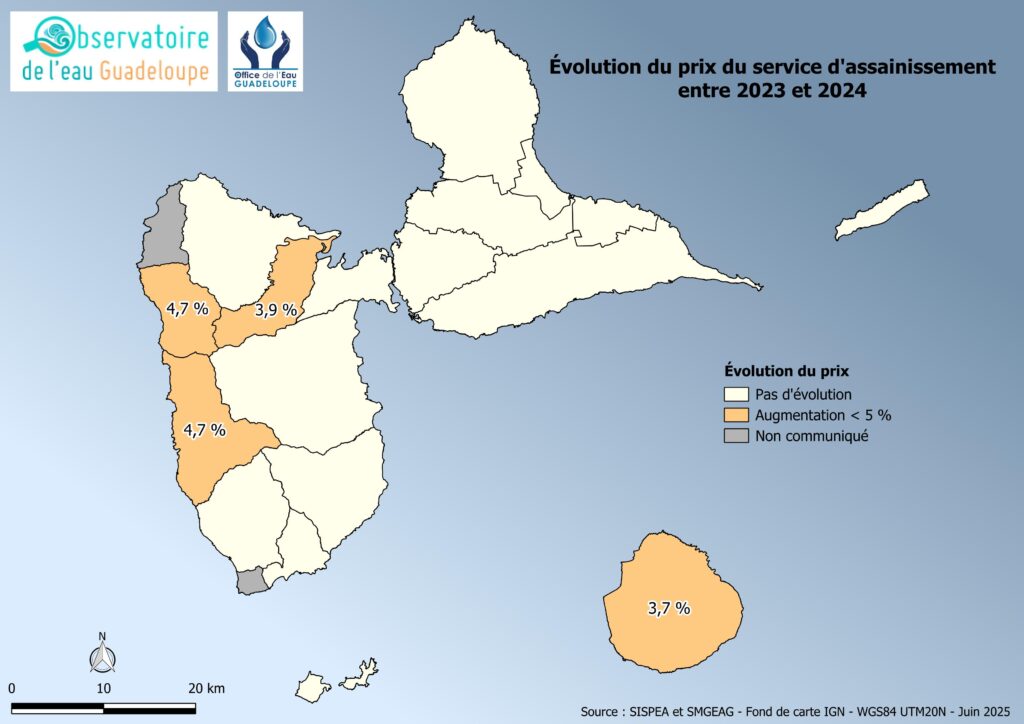 Sur les territoires en délégation du SMGEAG (Pointe-Noire, Bouillante / Vieux-Habitants et Lamentin) ainsi que sur Marie-Galante, on relève une faible augmentation du prix du service d’assainissement collectif, comprise entre 3,7 et 4,7 %.