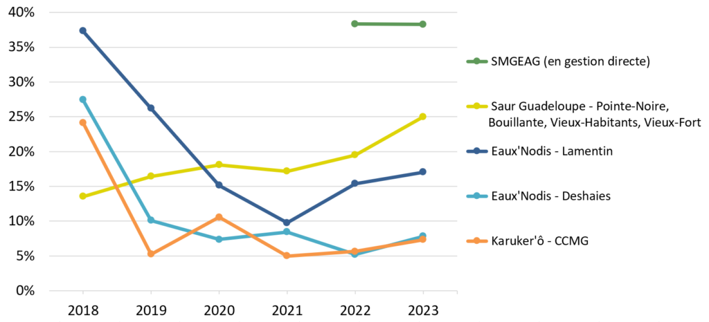 Sur les territoires en délégation du SMGEAG (Deshaies, Pointe-Noire, Bouillante / Vieux-Habitants, Vieux-Fort et Lamentin), on relève une faible augmentation du prix du service d’eau potable, comprise entre 0,2 et 1,3 %. À l’inverse, sur Marie-Galante, on note une légère baisse du prix du service, équivalente à – 0,5 %.