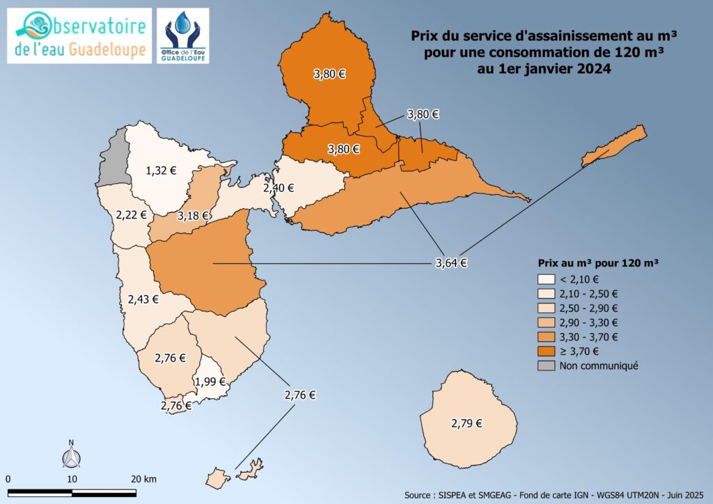 La carte suivante présente le prix du service d’assainissement en vigueur au 1er janvier 2024 sur les différents territoires de Guadeloupe :