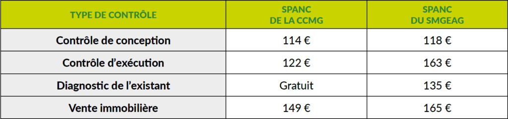 Les SPANC sont en charge du contrôle de ces installations ANC. Le tableau ci-dessous présente les tarifs pratiqués en 2023 par les différents SPANC de Guadeloupe :