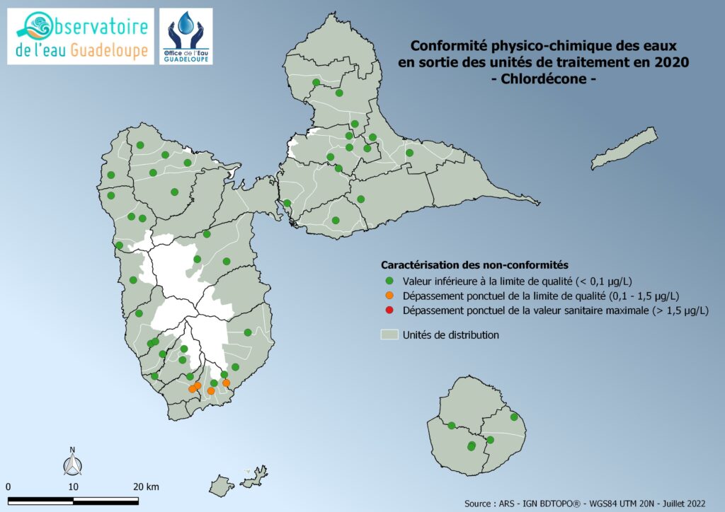 Sur l’ensemble des pesticides qui ont été analysés à la sortie des unités de potabilisation en 2022, seule la chlordécone a présenté de manière ponctuelle des non-conformités au niveau de 2 UPEP :