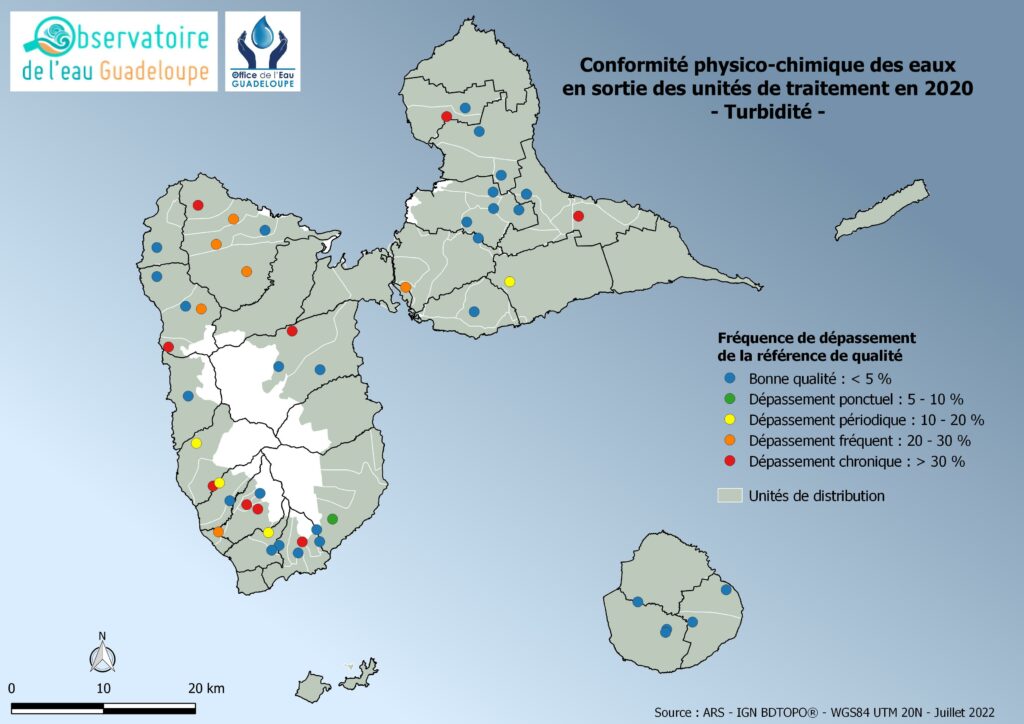 Lorsque l’on parle de la qualité de l’eau du robinet des usagers, il est préférable de raisonner en termes d’unité de distribution (UDI) lorsque cela est possible. L’UDI représente le réseau dans lequel la qualité de l’eau est réputée homogène. La distribution de l’eau en Guadeloupe est organisée en 65 UDI qui peuvent être alimentées par un ou plusieurs captages, et par une ou plusieurs usines de potabilisation.