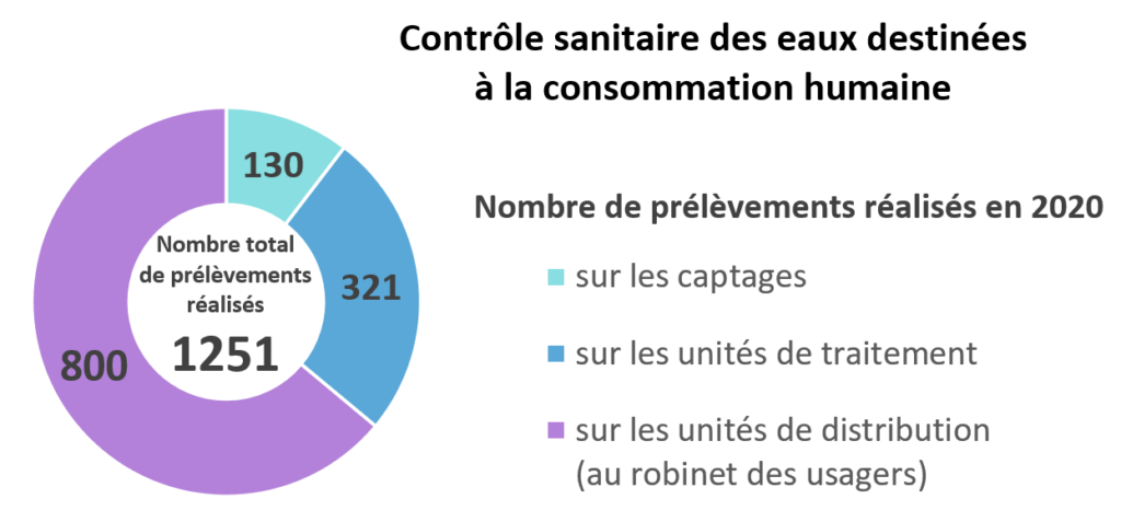 En 2022, l’ARS a réalisé 1 688 prélèvements dans le cadre du contrôle sanitaire des eaux destinées à la consommation humaine (Figure 25), qui viennent s’ajouter aux analyses d’autosurveillance qui doivent être réalisées par les exploitants.